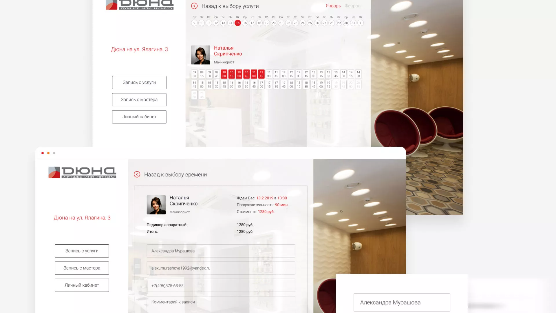 В разделе «Личный кабинет» содержатся все текущие записи в салоны красоты в Медвежьегорске, с возможностью их отмены. Также, здесь можно редактировать свои персональные данные, ознакомиться с историей записей и видеть бонусы и акции салонов красоты.